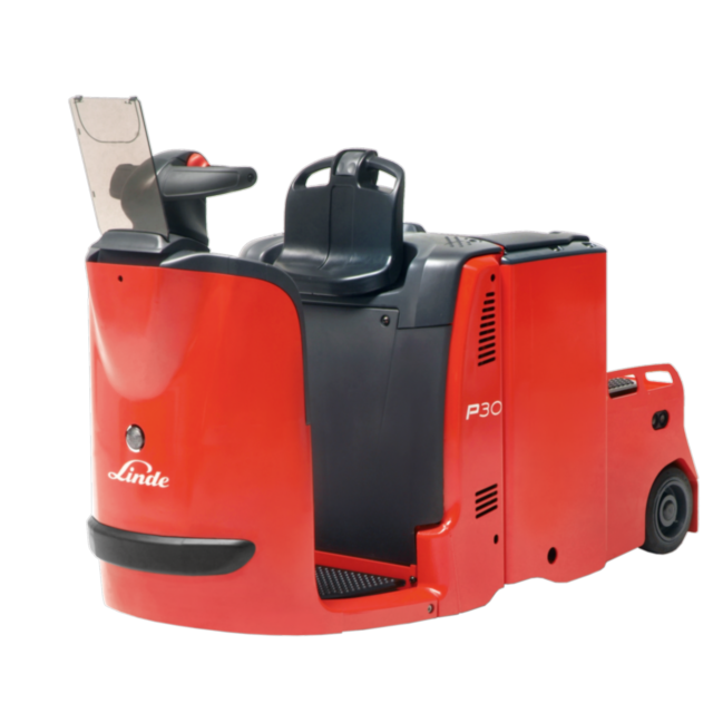 Linde Material Handling's P30 electric tow tractor and platform truck are perfect for flexible and safe transport over short and medium distances; even (and especially) when there is very little space available. The truck features precise self-centering power steering that the driver safely controls using the ergonomic two-handled steering unit. In addition, the P30's compact design makes maneuvering narrow aisles easier. The powerful three-phase motor accelerates quickly to its maximum speed. For comfort and stability while driving, the trucks are equipped with an adjustable backrest and a full-suspension standing platform with a nonslip floor covering. The P30 has a maximum load capacity of three tons. It can reach a maximum speed of 10 kilometers per hour.